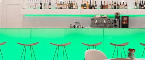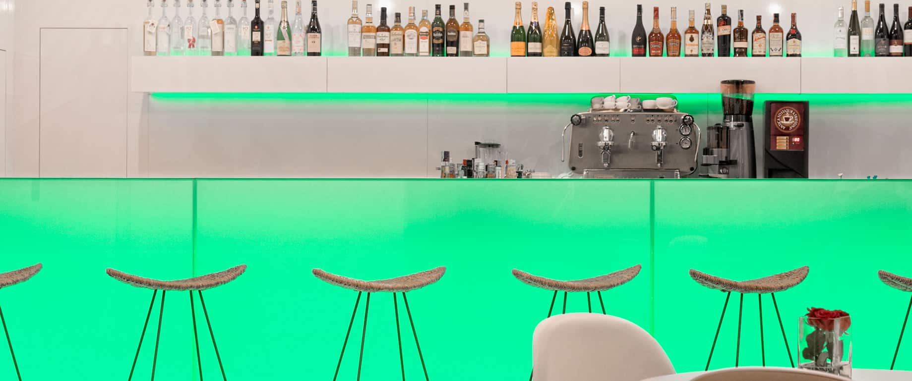 Bar raffinato ed elegante, il “Corte 22” accoglie gli ospiti in un ambiente magico, dove la luce e i colori creano un gioco suggestivo tra iridescenza artificiale e luminosità naturale e gli spazi interni ed esterni si dilatano e si fondono continuamente.