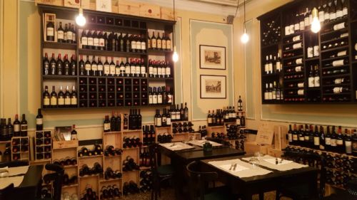 Alle pareti ci sono anche della scansie in legno con vetrine dentro alle quali fanno bella mostra file di bottiglie di vino e di barattoli di confettura. Nel complesso un ambiente dall’atmosfera calda e accogliente, dove i clienti possono sceglier tra la degustazione di un vino, il piacere di un pranzo o di una cena o quello minimale, del caffè per una pausa nel cuore della città.