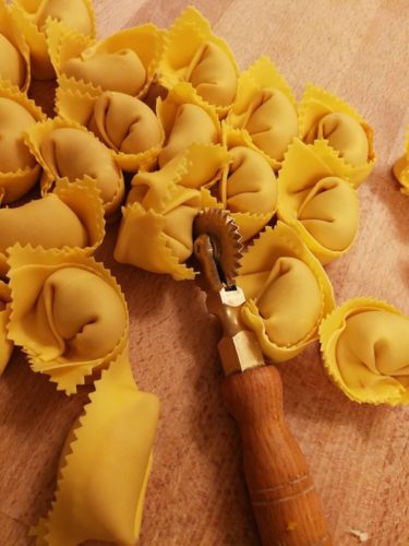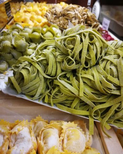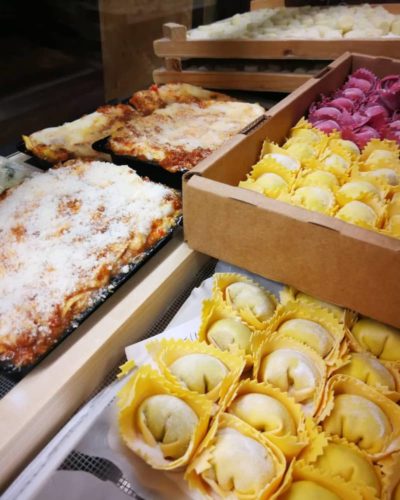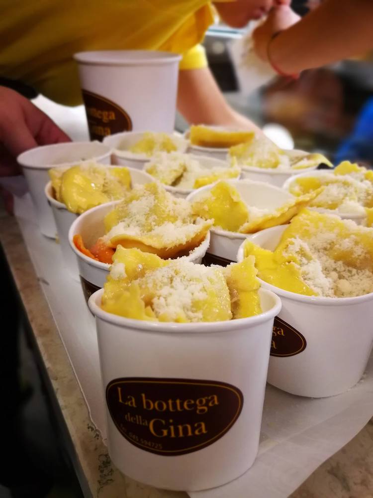 Pasta fresca, tortellini da passeggio, degustazione in Bottega