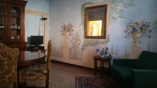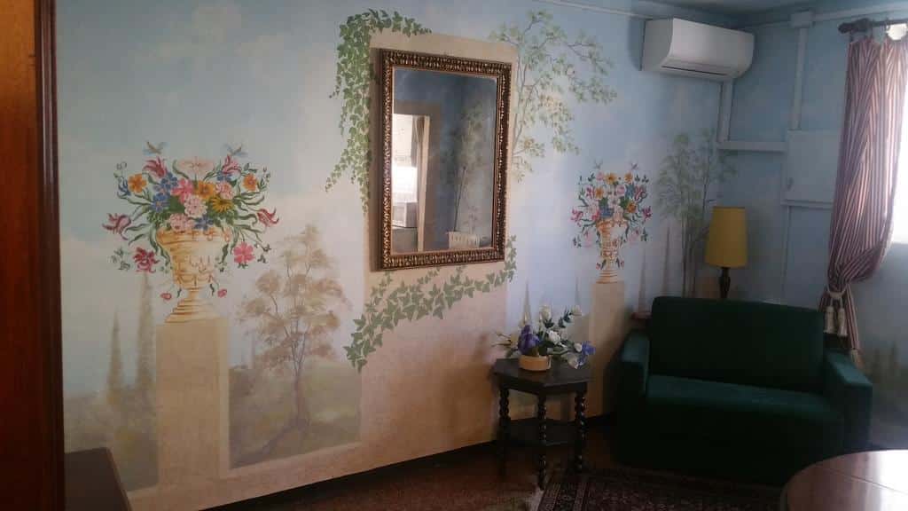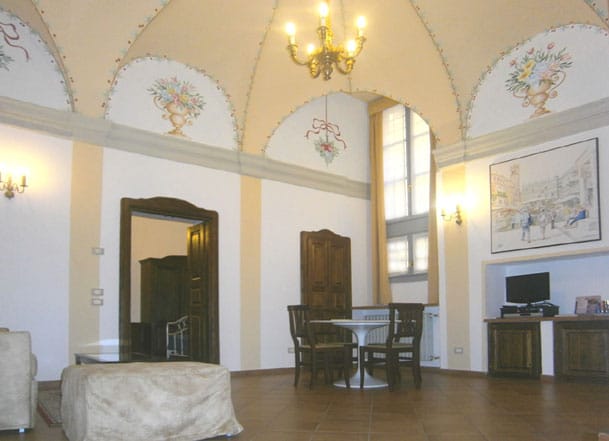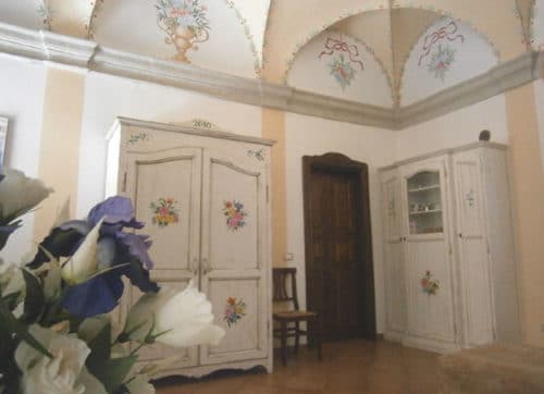 Le pareti sono decorate con pitture a trompe l’oeil e l’arredamento è di sapore classico.