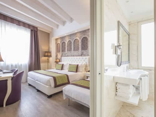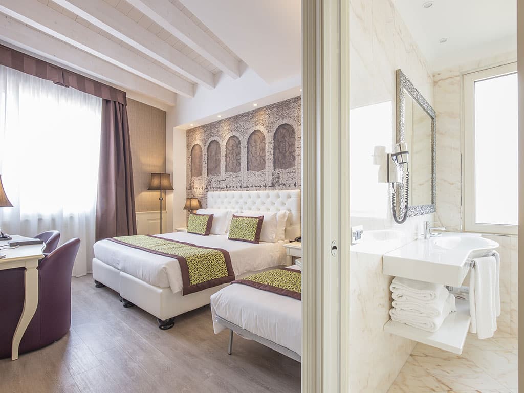 Le 47 camere, tutte doppie superior di ampie dimensioni, sono state pensate per offrirvi il massimo comfort di un Hotel veramente a “quattro stelle”. I bagni, rivestiti del prezioso marmo “Rosa Aurora Vigaria” del Portogallo, sono dotati di confortevole doccia o vasca, asciugacapelli, termoarredo e un ricco set di cortesia.