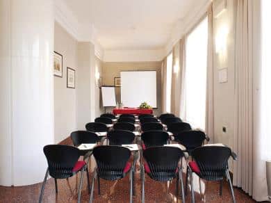 L’Hotel dispone al piano terra di una luminosa sala convegni in grado di accogliere fino a 30 persone sedute a platea. La sala è dotata di accesso a internet con linea ADSL/Wi-Fi free e soprattutto gode di illuminazione naturale. Nell’affitto della sala congressi sono compresi il primo giro di acqua minerale, block-notes, penna, lavagna a fogli mobili, lavagna luminosa, schermo per proiezioni. A pagamento è possibile prenotare il videoproiettore. Inoltre, a richiesta, saremo lieti di prepararvi coffee breaks e colazioni di lavoro, con scelta tra vari menù. Particolari sconti a chi, oltre la sala congressi, volesse richiedere anche il pernottamento.
