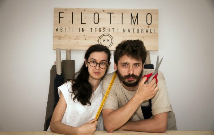 Passiamo alle cose serie, che dite? Gloria è la fondatrice di Filotimo (facebook), è laureata in Design della moda al Politecnico di Milano e già durante gli anni di studio indaga e s’interessa di materiali alternativi e dell’impatto ambientale della lavorazione di certi tessuti. Matteo è invece un architetto, laureato anche lui al Politecnico di Milano ed è lo “sguattero tuttofare”(sue parole) che sta dietro agli allestimenti di Filotimo e che ha avuto lo stesso ruolo dell’acqua che corrode la roccia: ha spinto Gloria a inseguire il suo progetto di rendere più ecologici i vestiti. Se poi ci volete aggiungere che Gloria è la nipote di due nonne sarte, ecco la quadratura del cerchio.